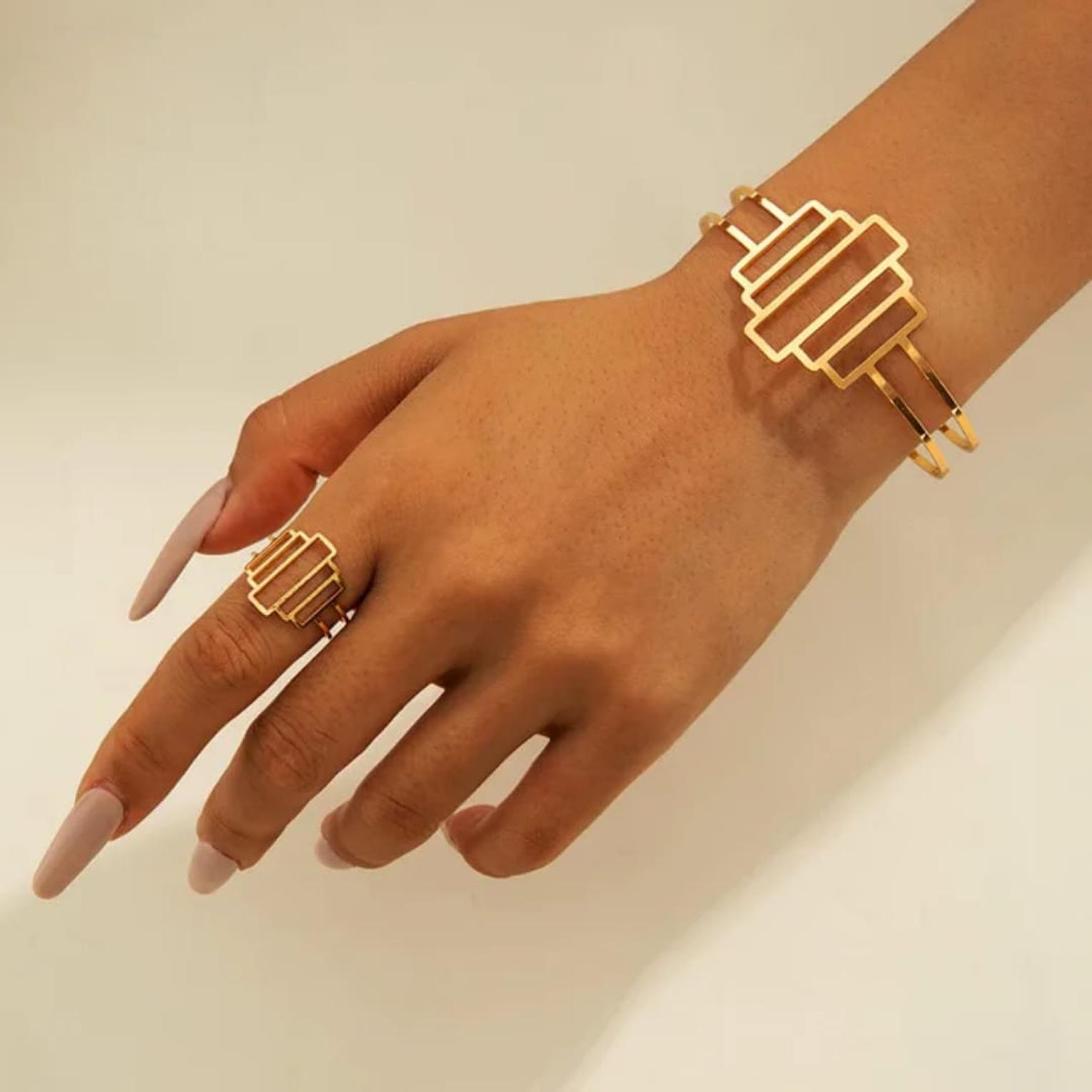 A sleek 5 rectangle bracelet and ring set designed for modern, structured style.