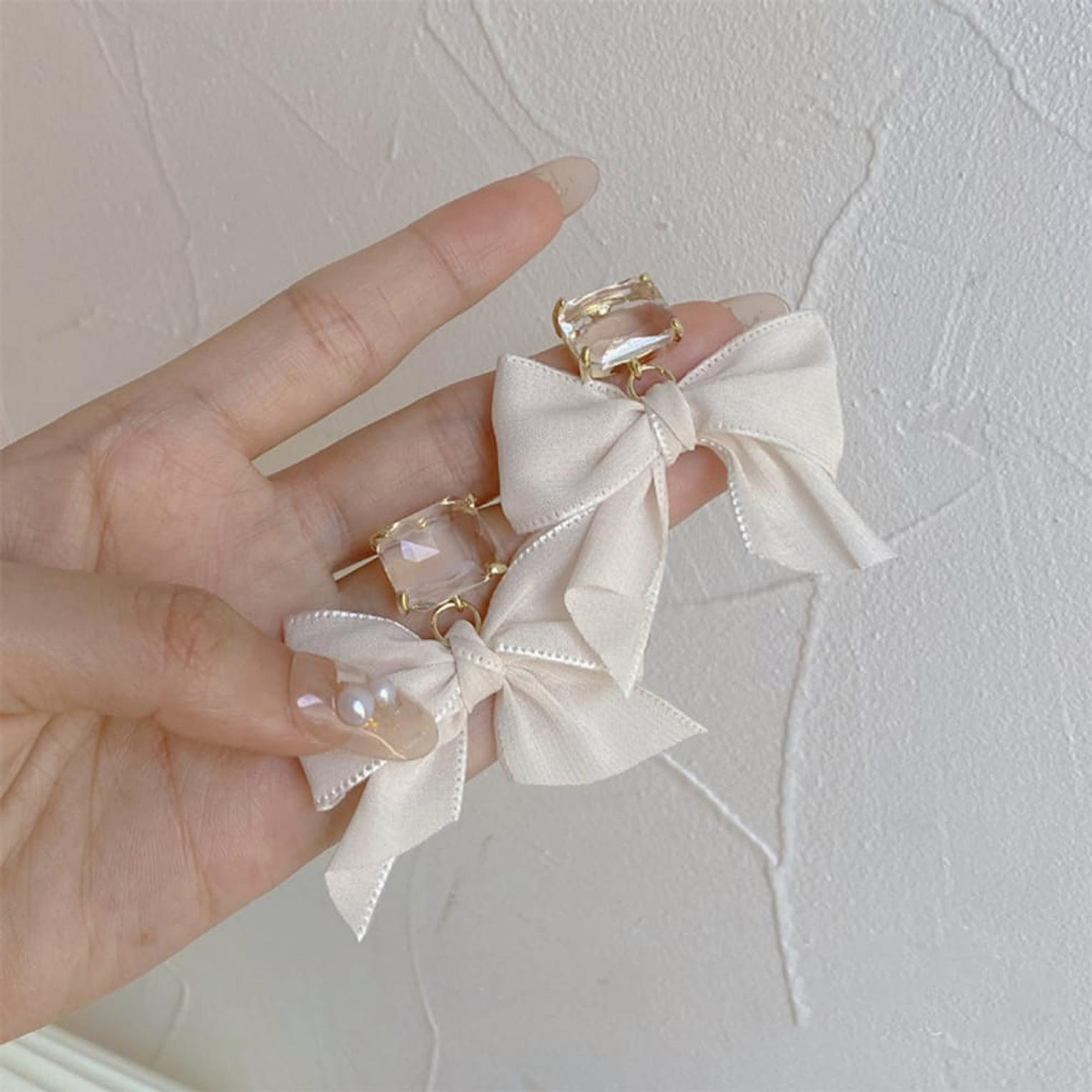 Delicate beige bow crystal earrings that offer understated elegance with a touch of sparkle.