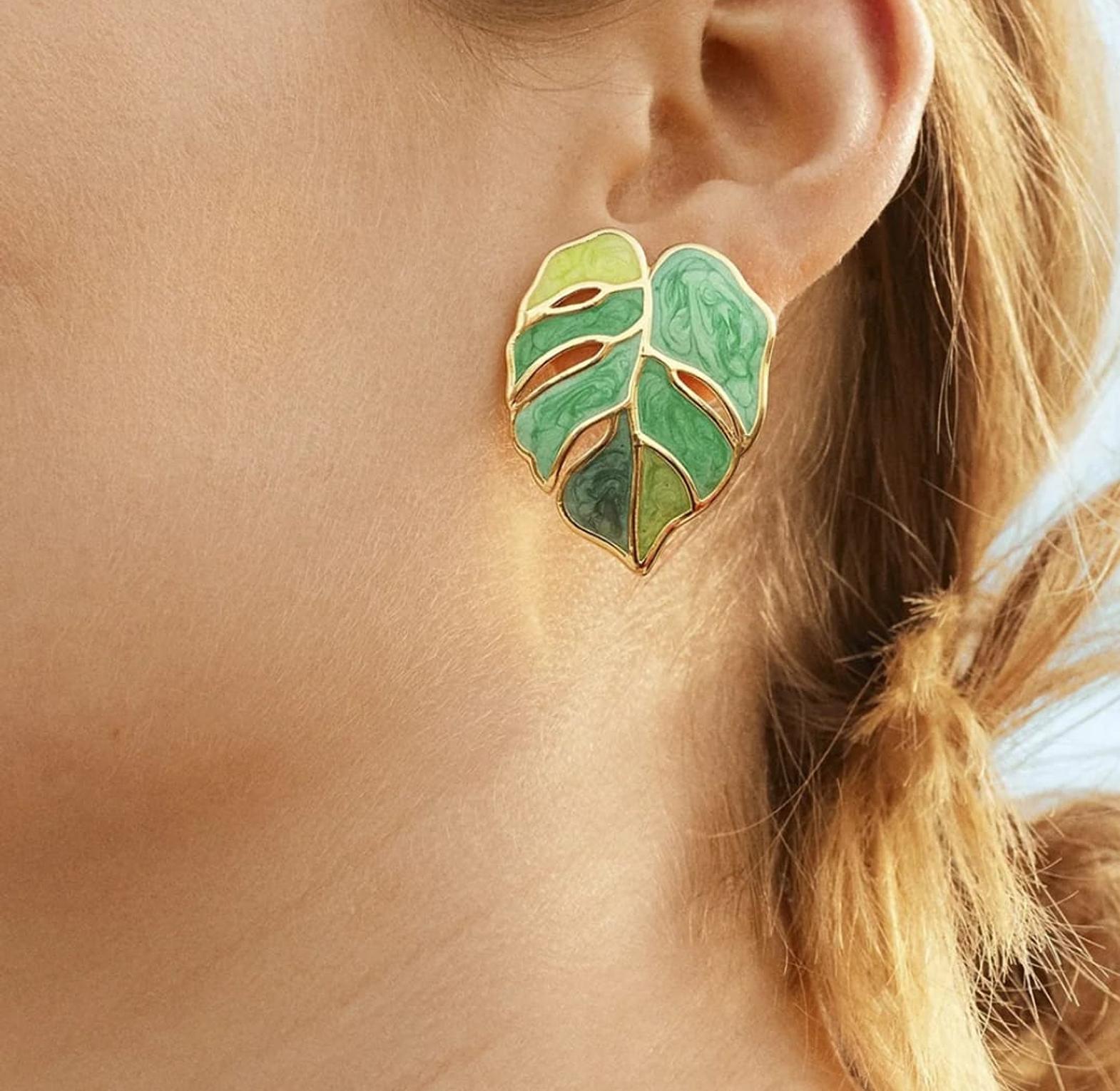 Fresh green monstera earrings that bring a bold, tropical leaf statement to your look.