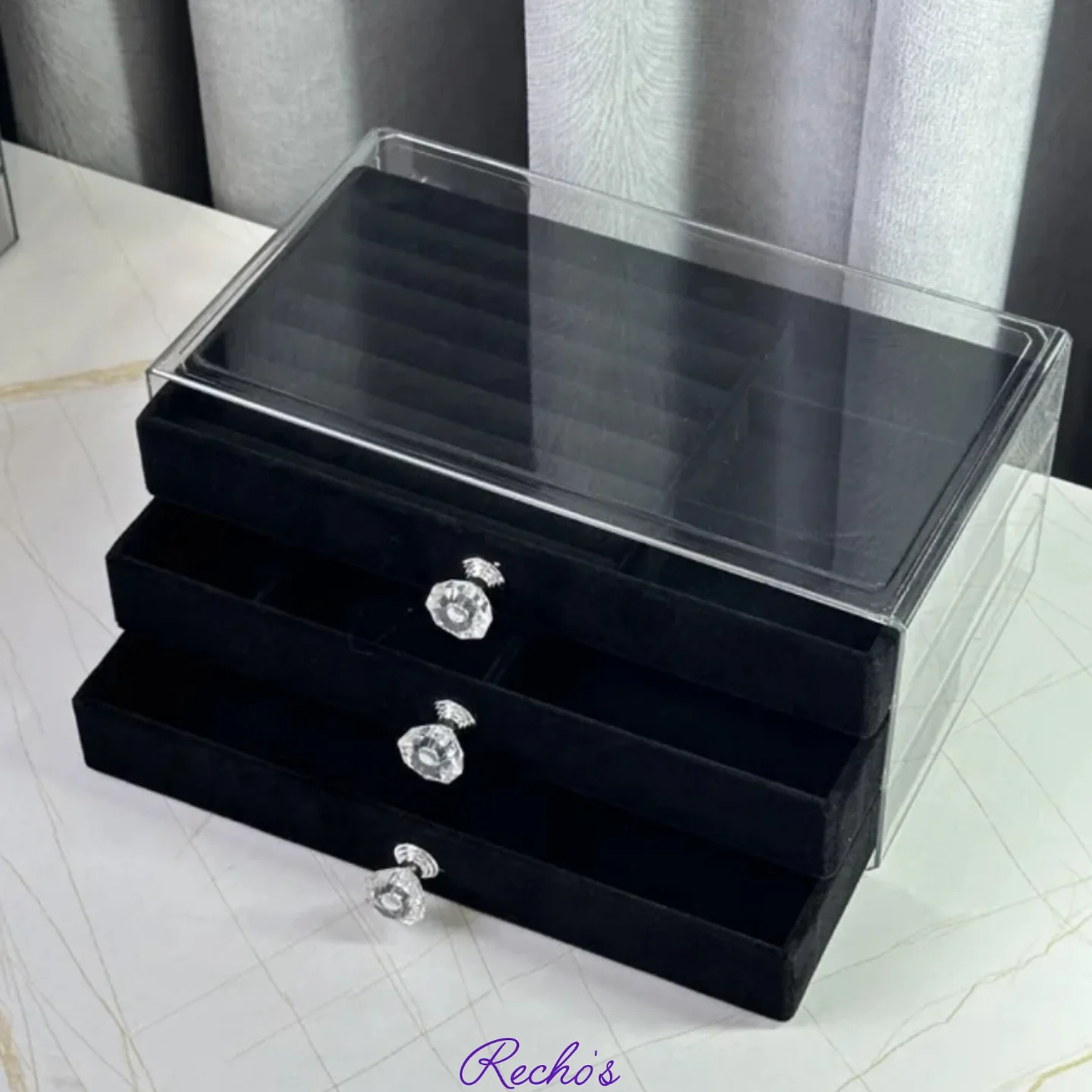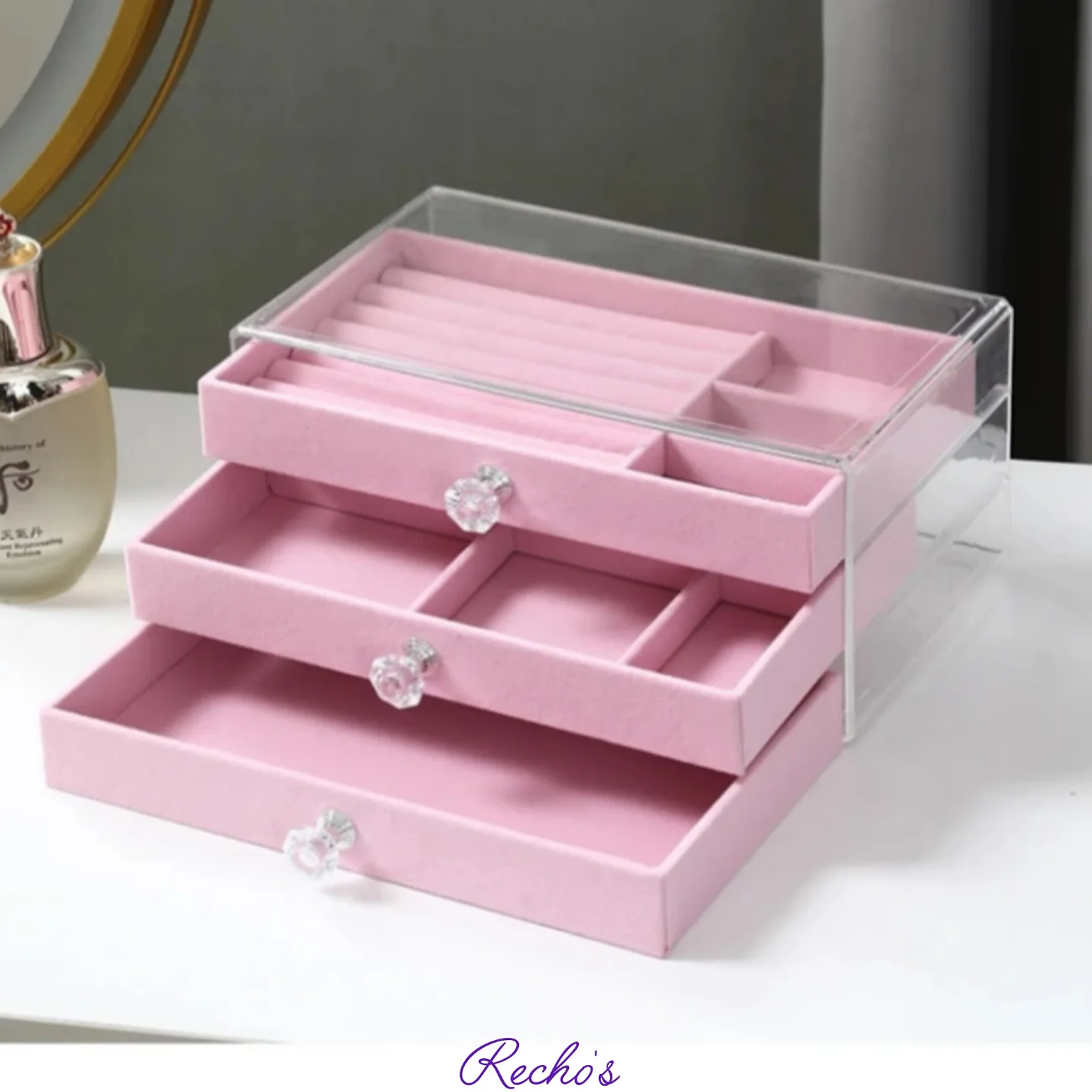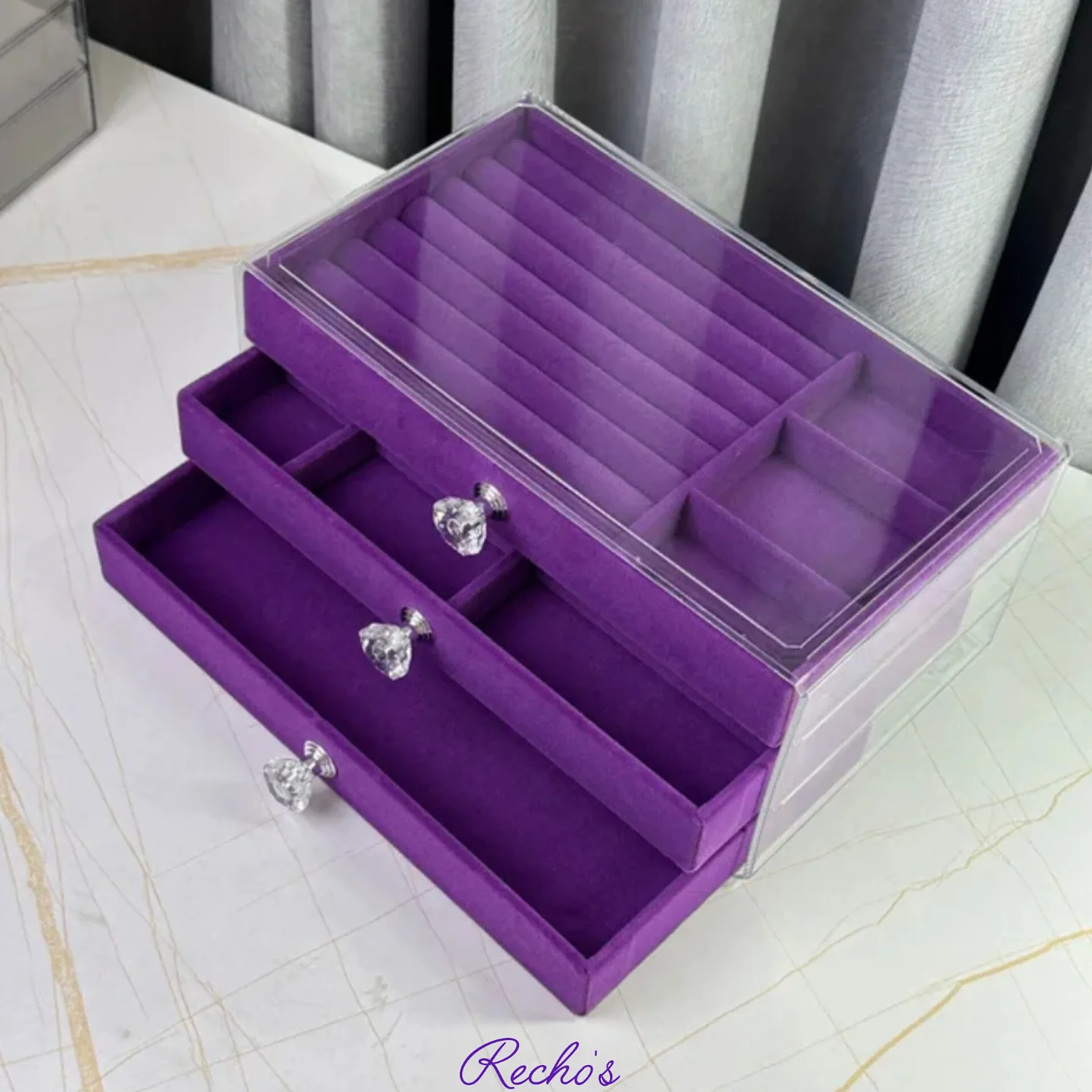 A stylish jewel organizer designed to safely store and organize rings, earrings, necklaces, and bracelets, keeping them secure, tangle-free, and easy to access.
