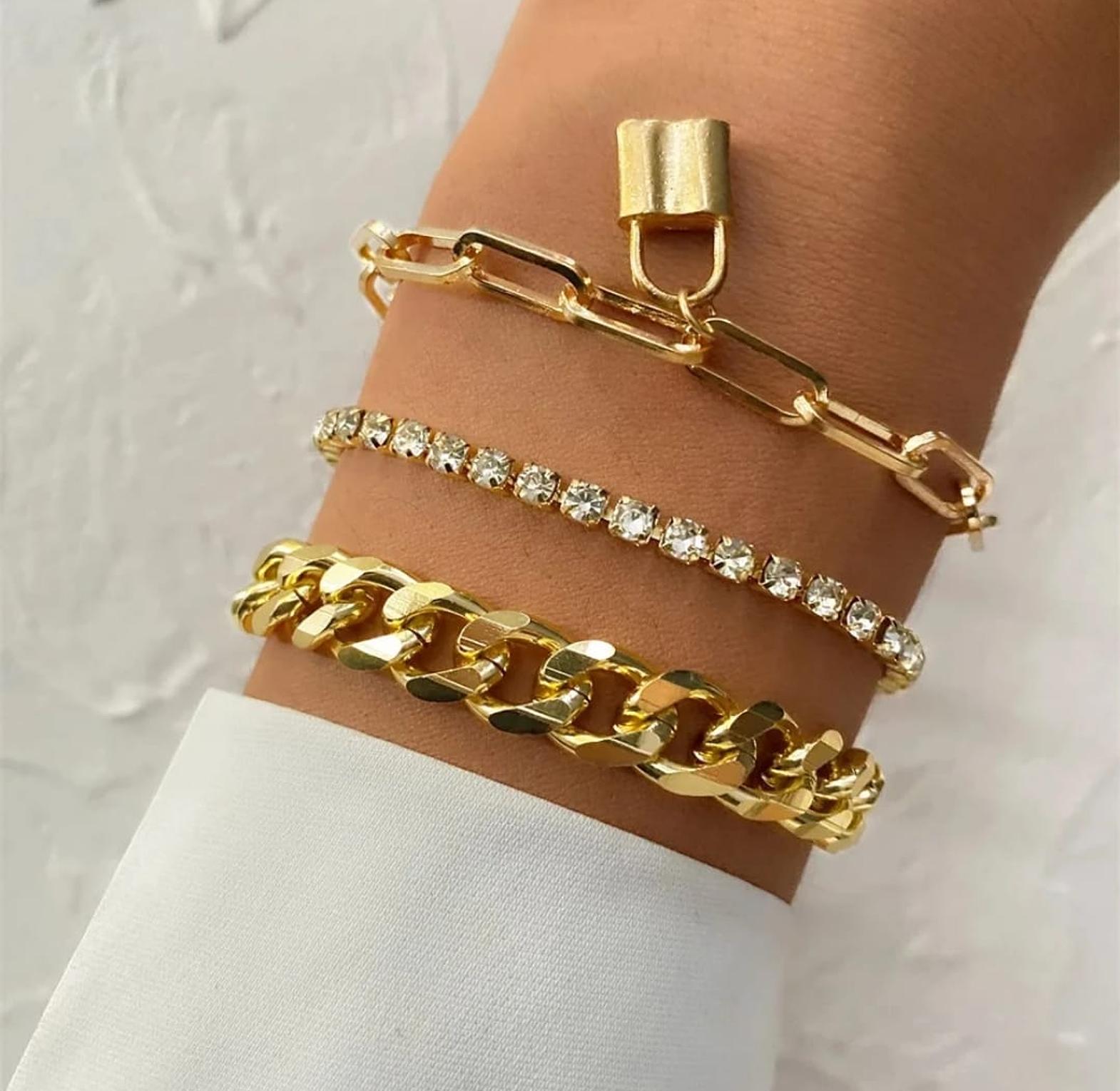 This padlock bracelet set features sleek padlock details that symbolise strength and connection. Stylish and versatile, the bracelets can be worn together for a confident look or individually for subtle edge. A contemporary set that adds character and polished appeal to any jewellery collection.