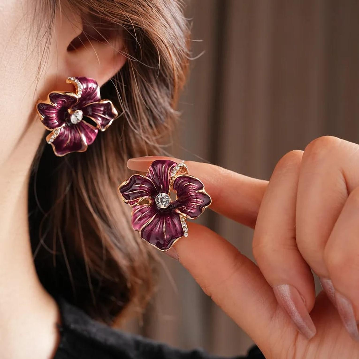 Vibrant purple hibiscus earrings that bring a tropical, floral charm to any outfit.