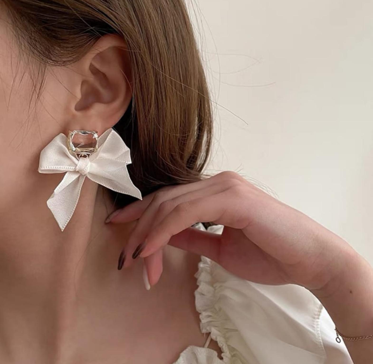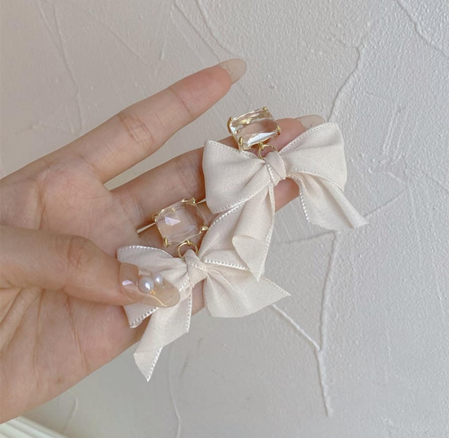 Delicate beige bow crystal earrings that offer understated elegance with a touch of sparkle.