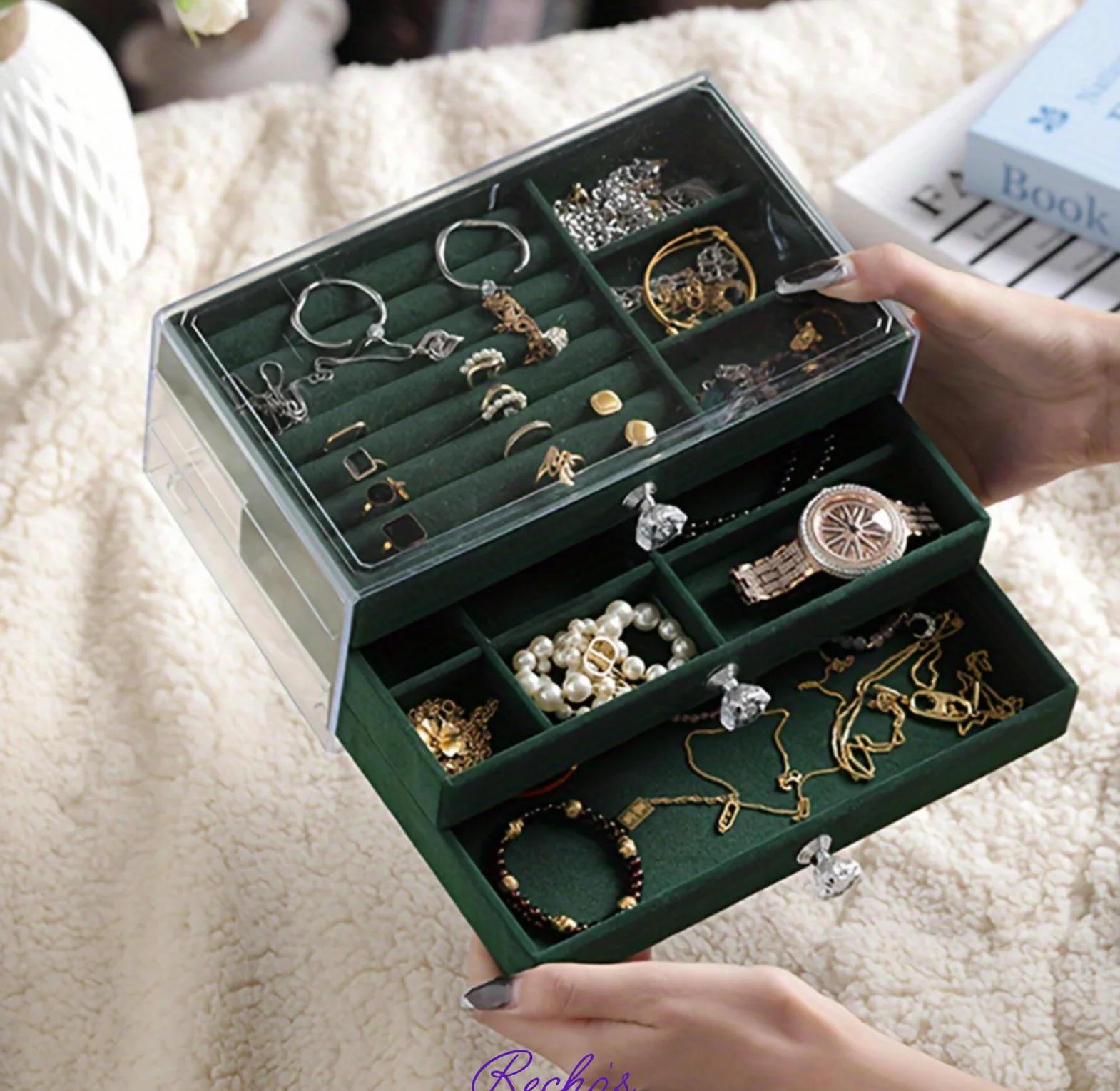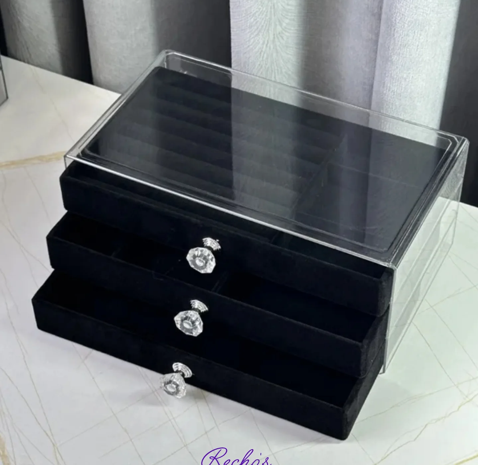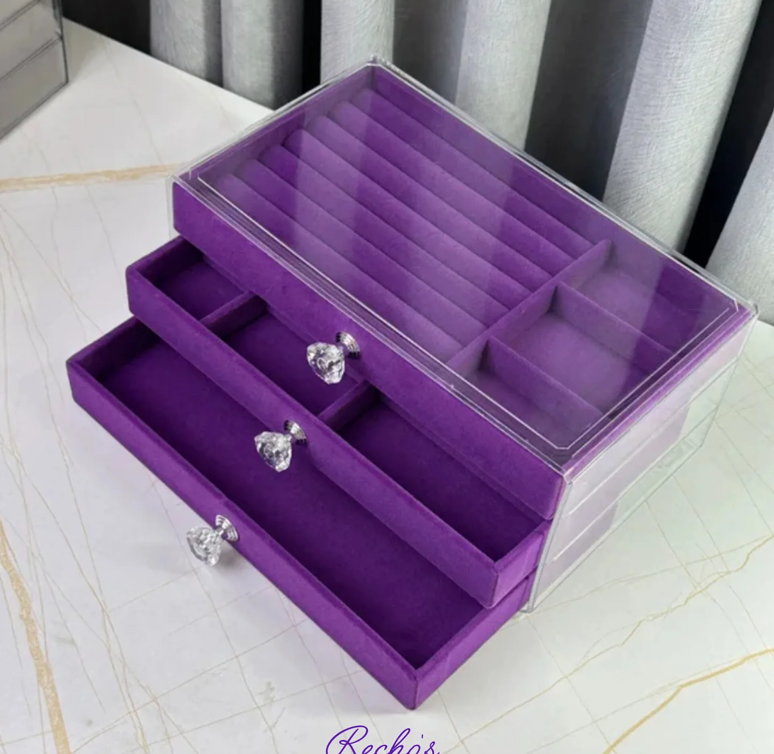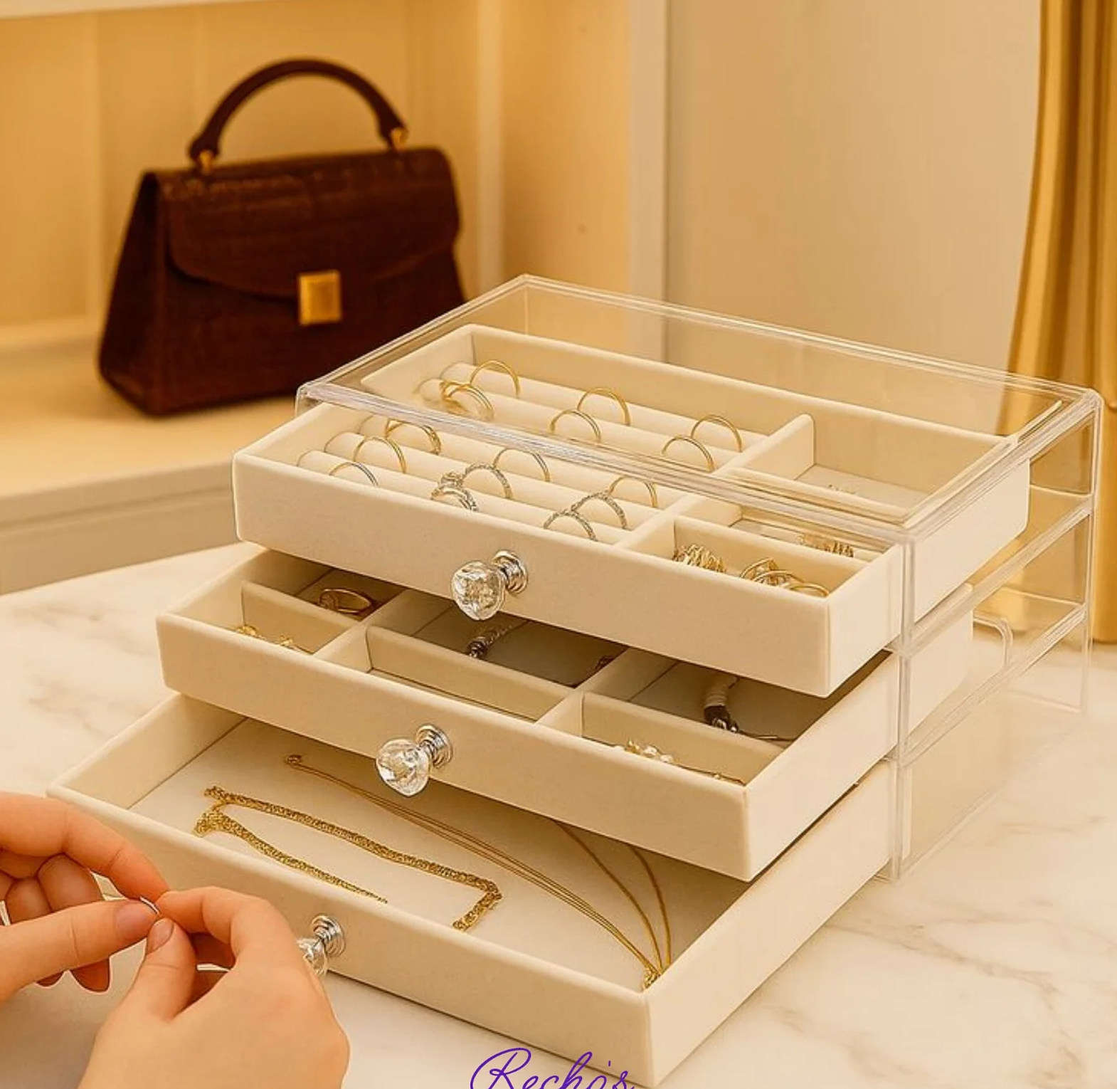 A stylish jewel organizer designed to safely store and organize rings, earrings, necklaces, and bracelets, keeping them secure, tangle-free, and easy to access.