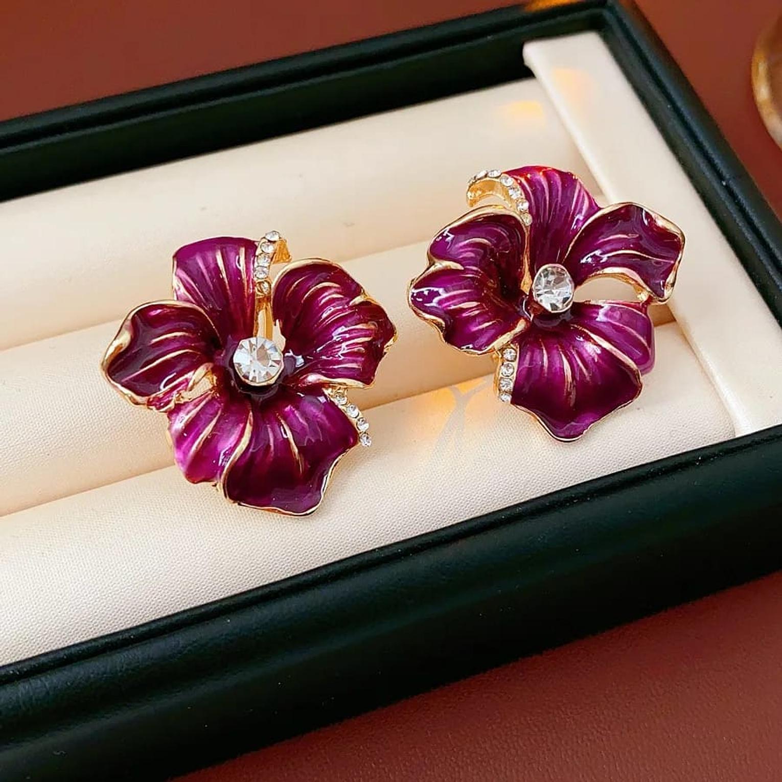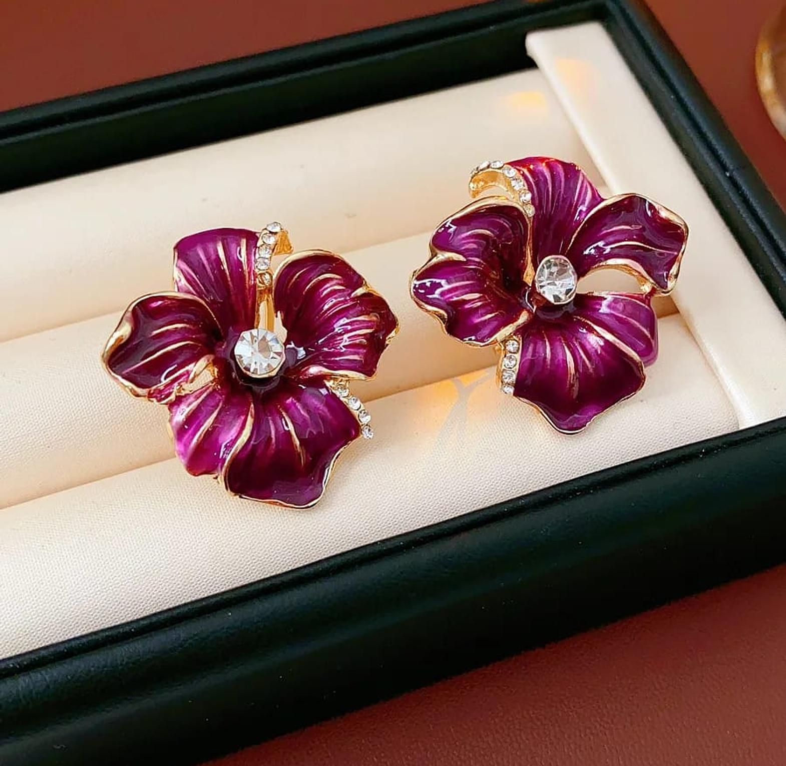 Vibrant purple hibiscus earrings that bring a tropical, floral charm to any outfit.